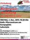 Zur Preisverleihung, die im Rahmen einer kleinen Feierstunde stattfinden wird, lädt die SPD alle interessierten Bürgerinnen und Bürger herzlich für Freitag, 1. Dezember 2017, um 19.30 Uhr, ins Kath. Pfarrzentrum am Europaplatz, nach 56112 Lahnstein, ein.
